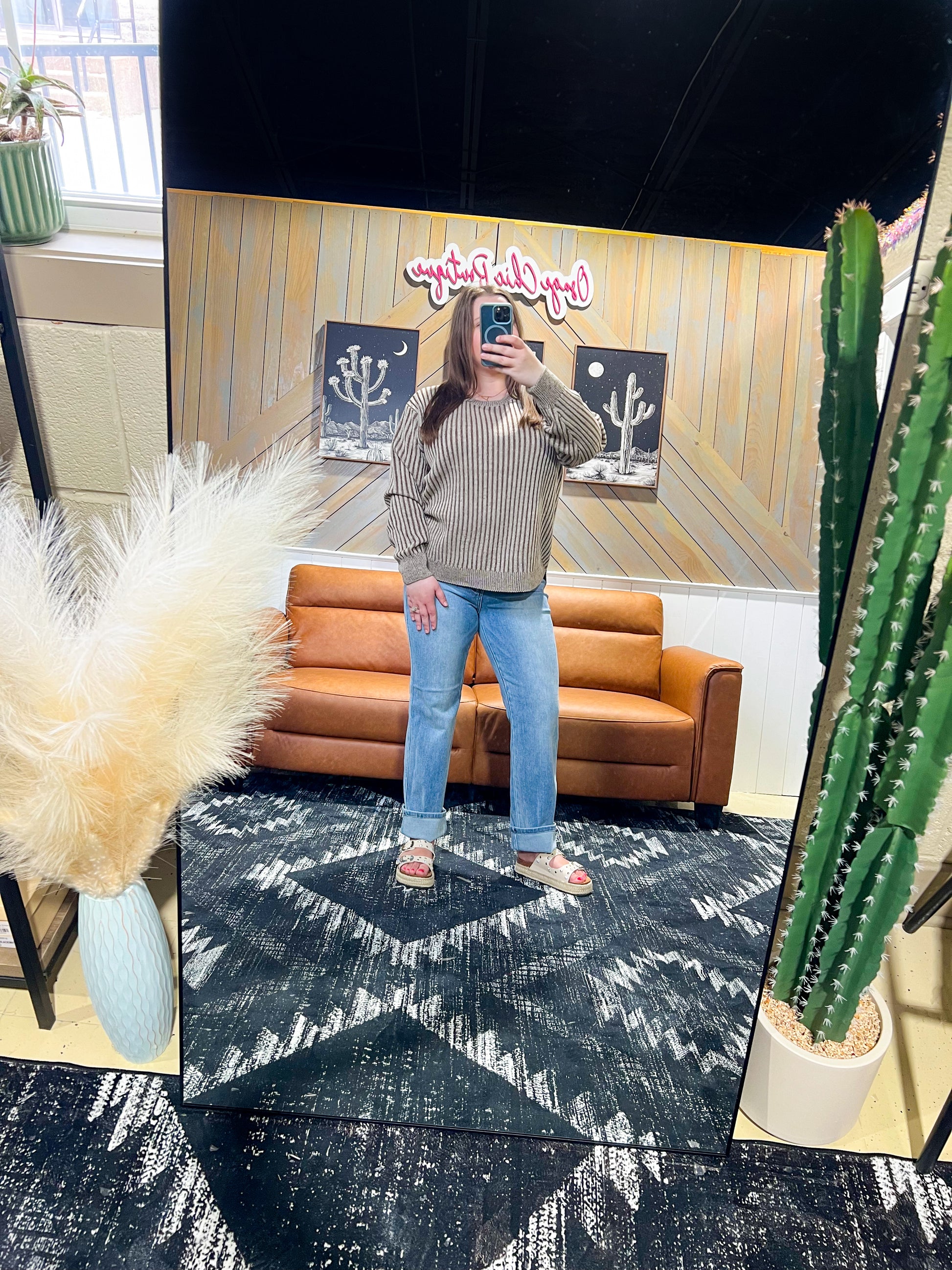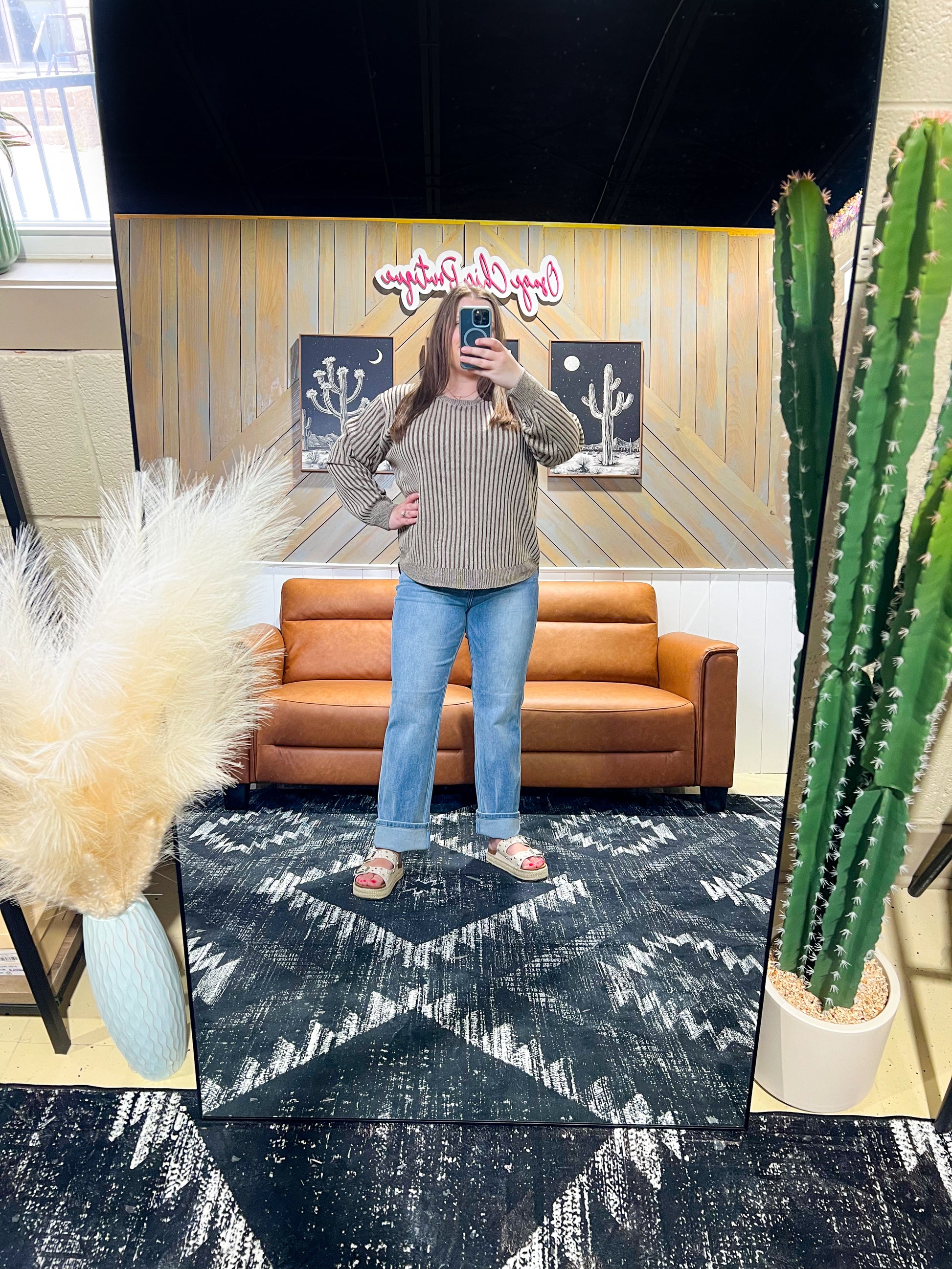 This trendy sweater features a unique two-tone design and ribbed texture, perfect for adding a touch of neutral fun to your wardrobe. True to size.