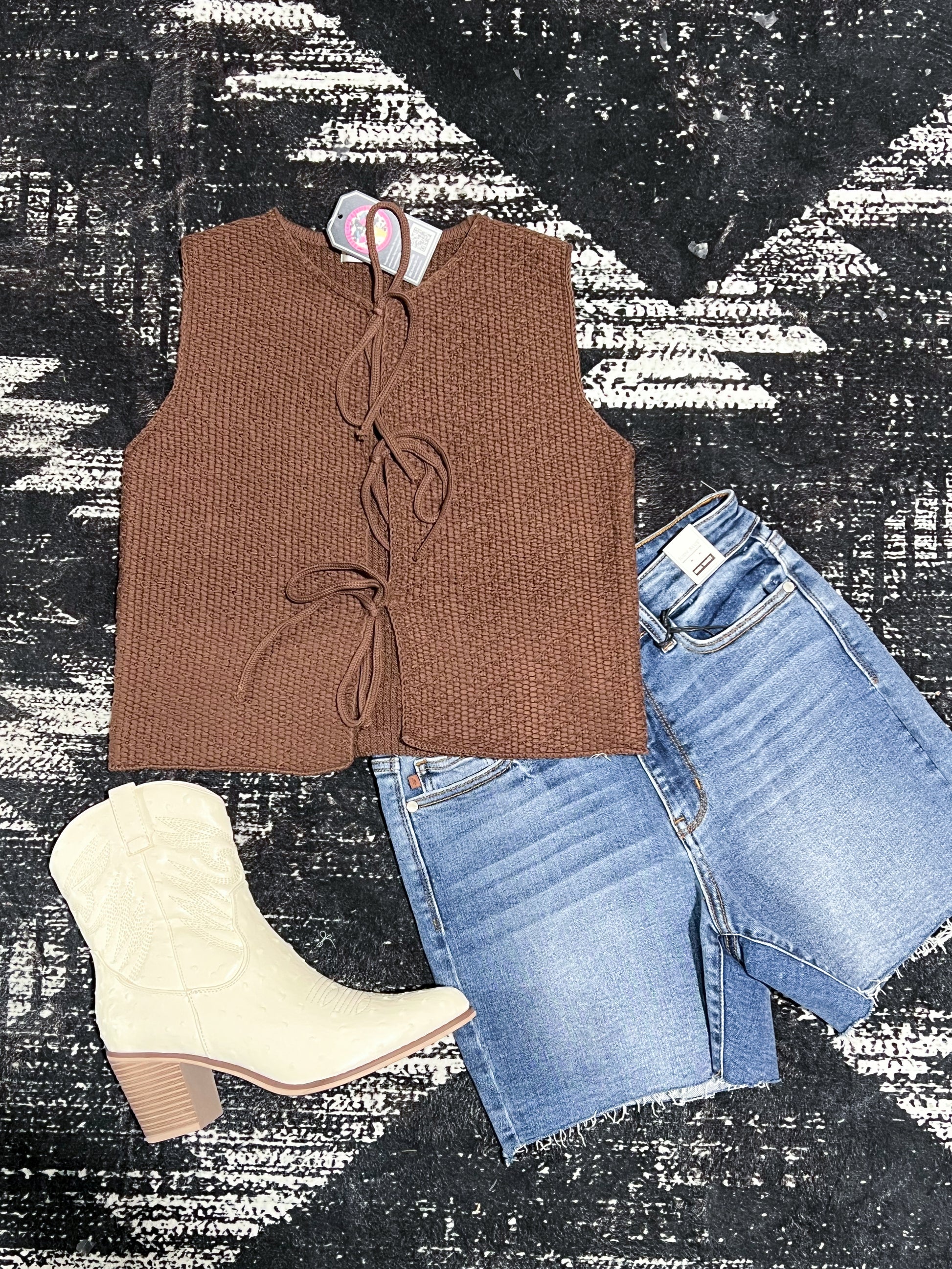 Introducing the Brown Tie Front Vest, featuring the perfect combination of two of this year's top trends: bows and vests. This versatile piece offers endless styling possibilities, making it a must-have in your wardrobe.
