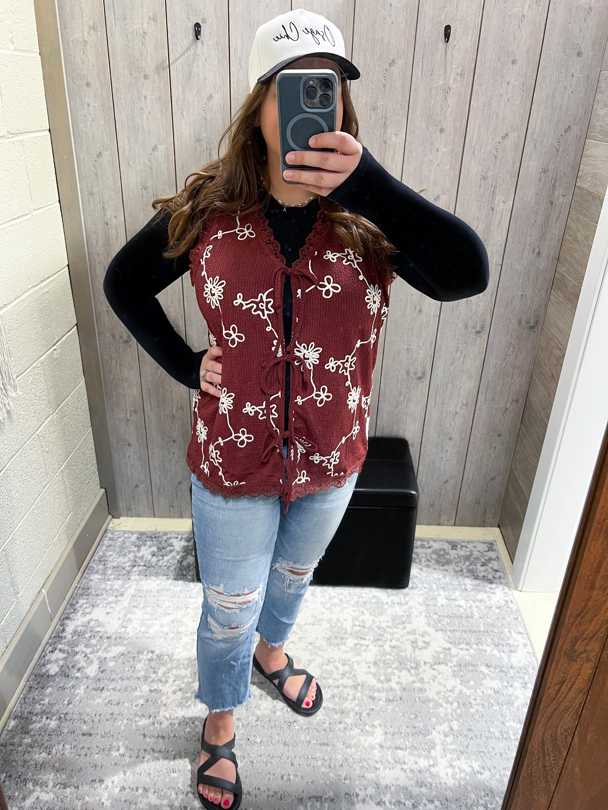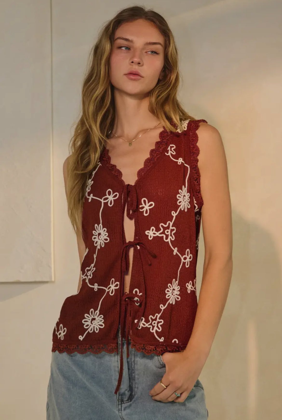 Burgundy Embroidered Tie Front Vest