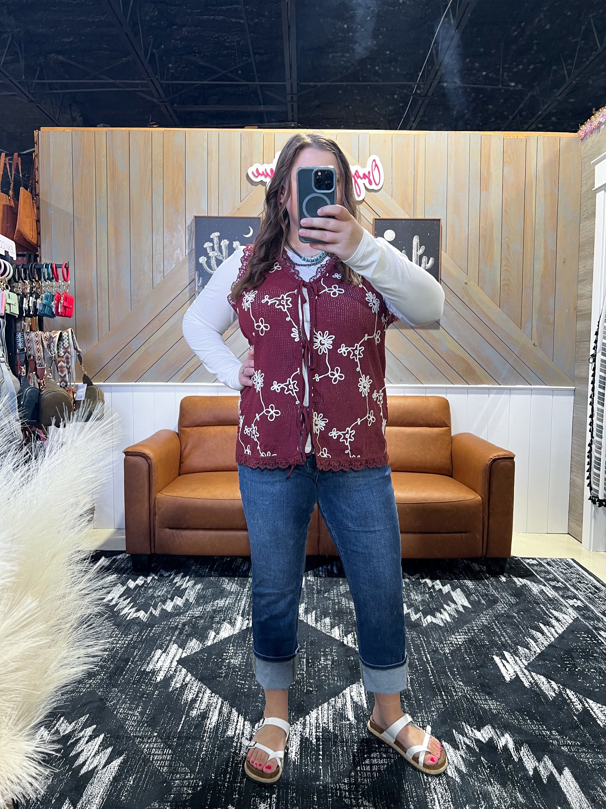 This elegant Burgundy Embroidered Tie Front Vest adds a touch of sophistication to any outfit. The delicate lace trim and intricate embroidery make it a versatile and stylish piece. With its tie front detail, it can be worn in a variety of ways, making it a must-have for any wardrobe.