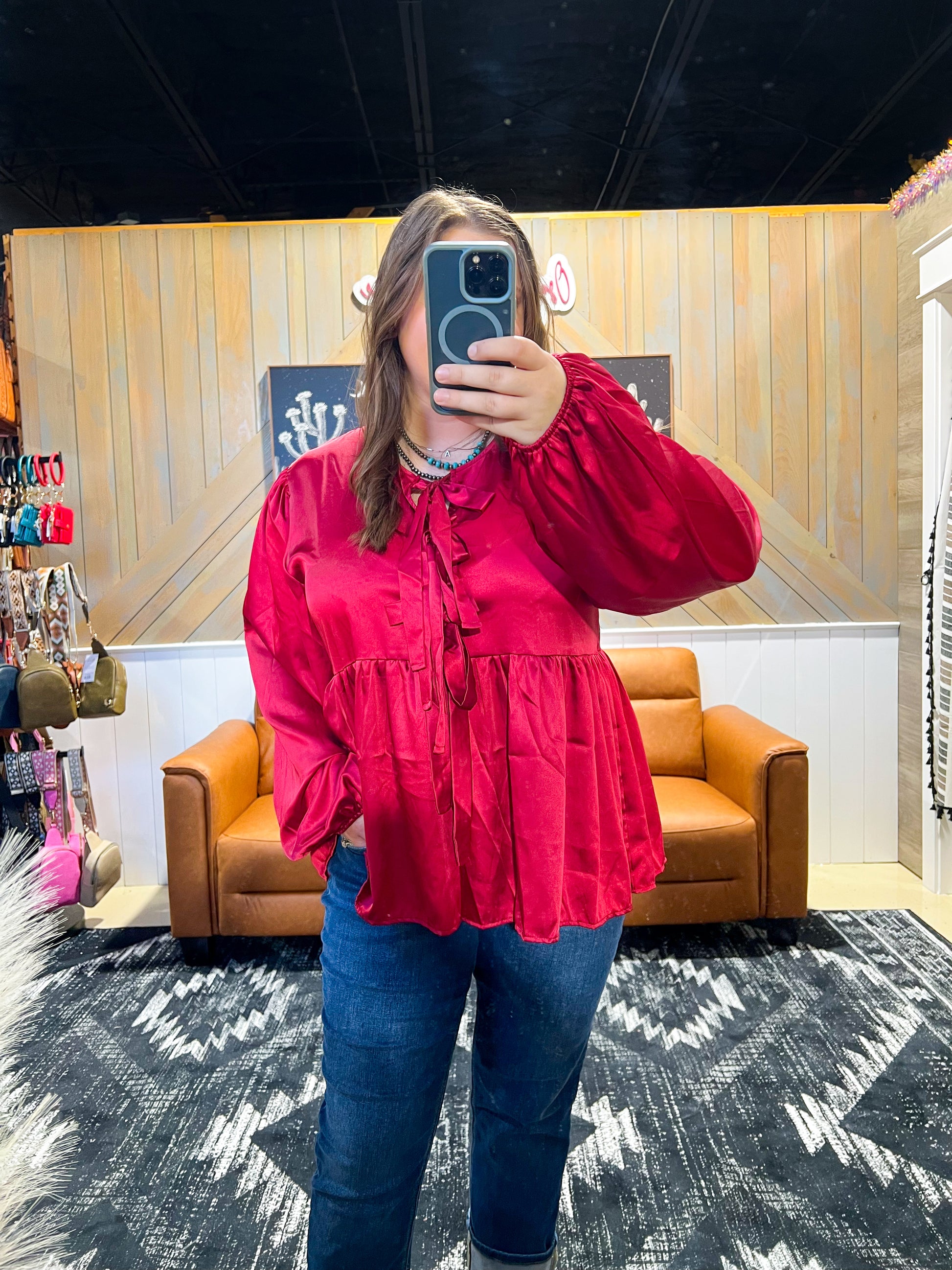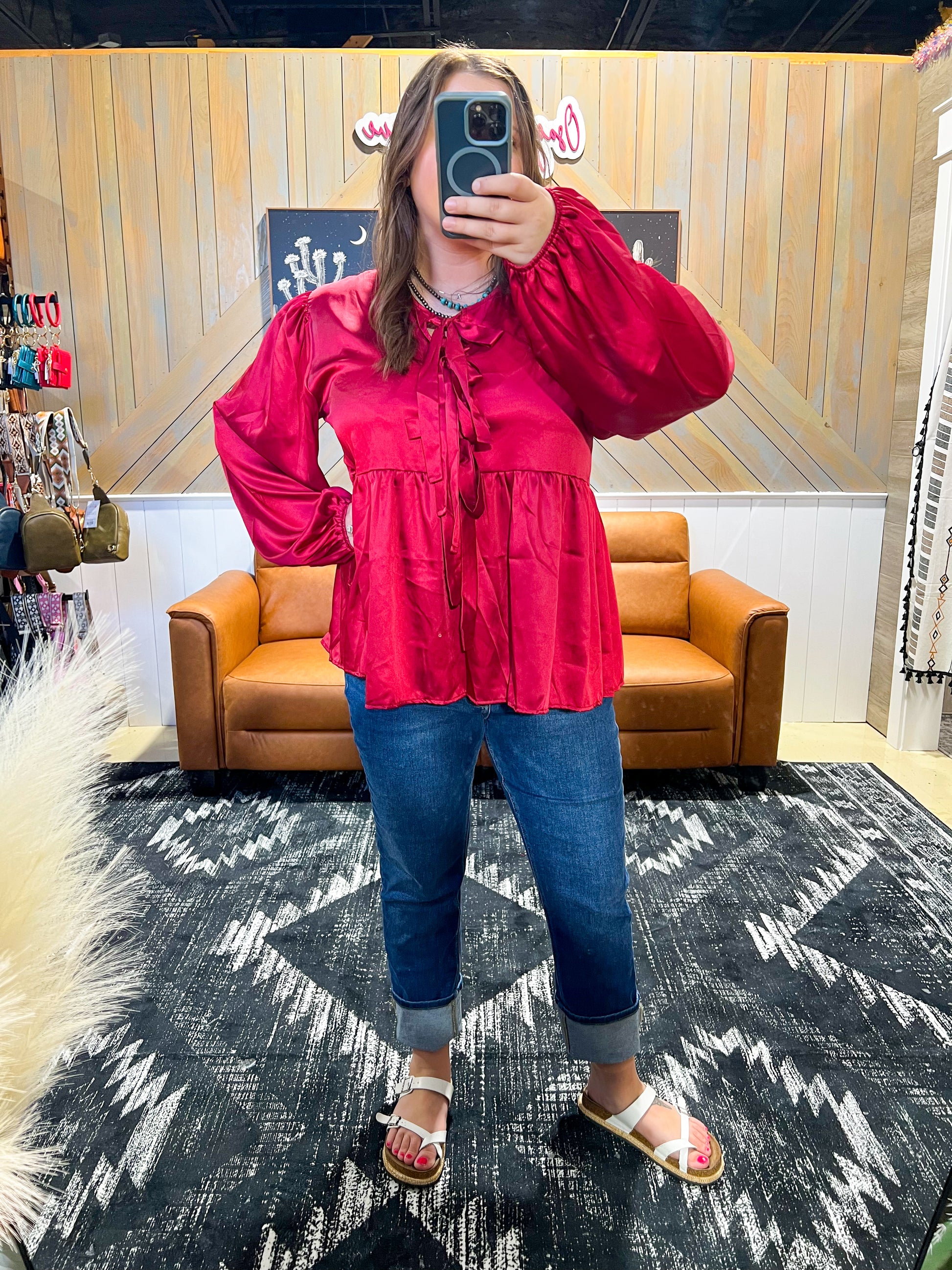 Add a touch of elegance to your wardrobe with our Burgundy Silk Bow Front Babydoll Blouse. The lightweight satin material is perfect for Fall and holiday parties, while the flattering babydoll silhouette will have you feeling confident and comfortable. Plus, it photographs beautifully - perfect for those winery trips or family photos!