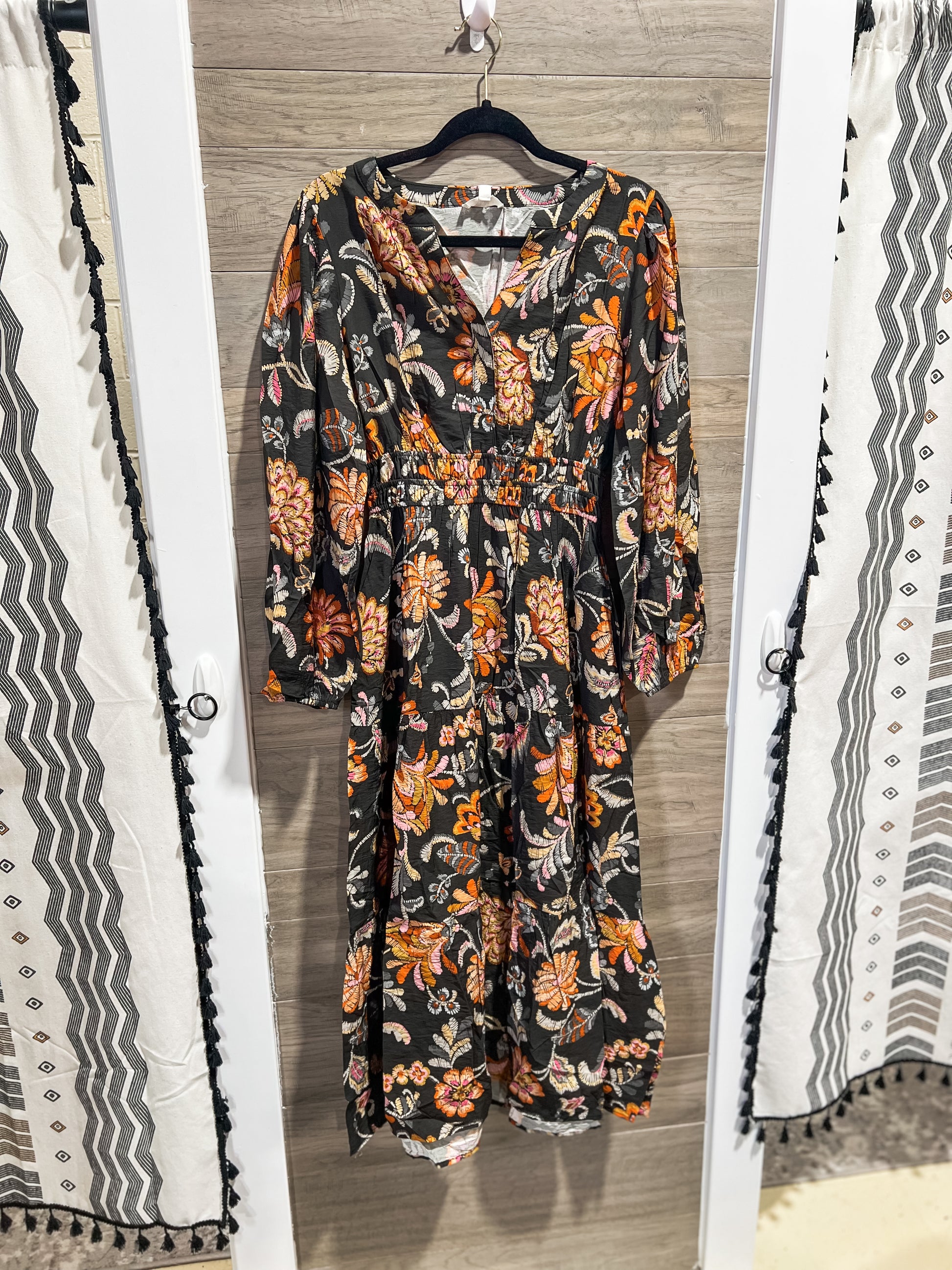 Charcoal Boho Floral Long Sleeve Maxi Dress