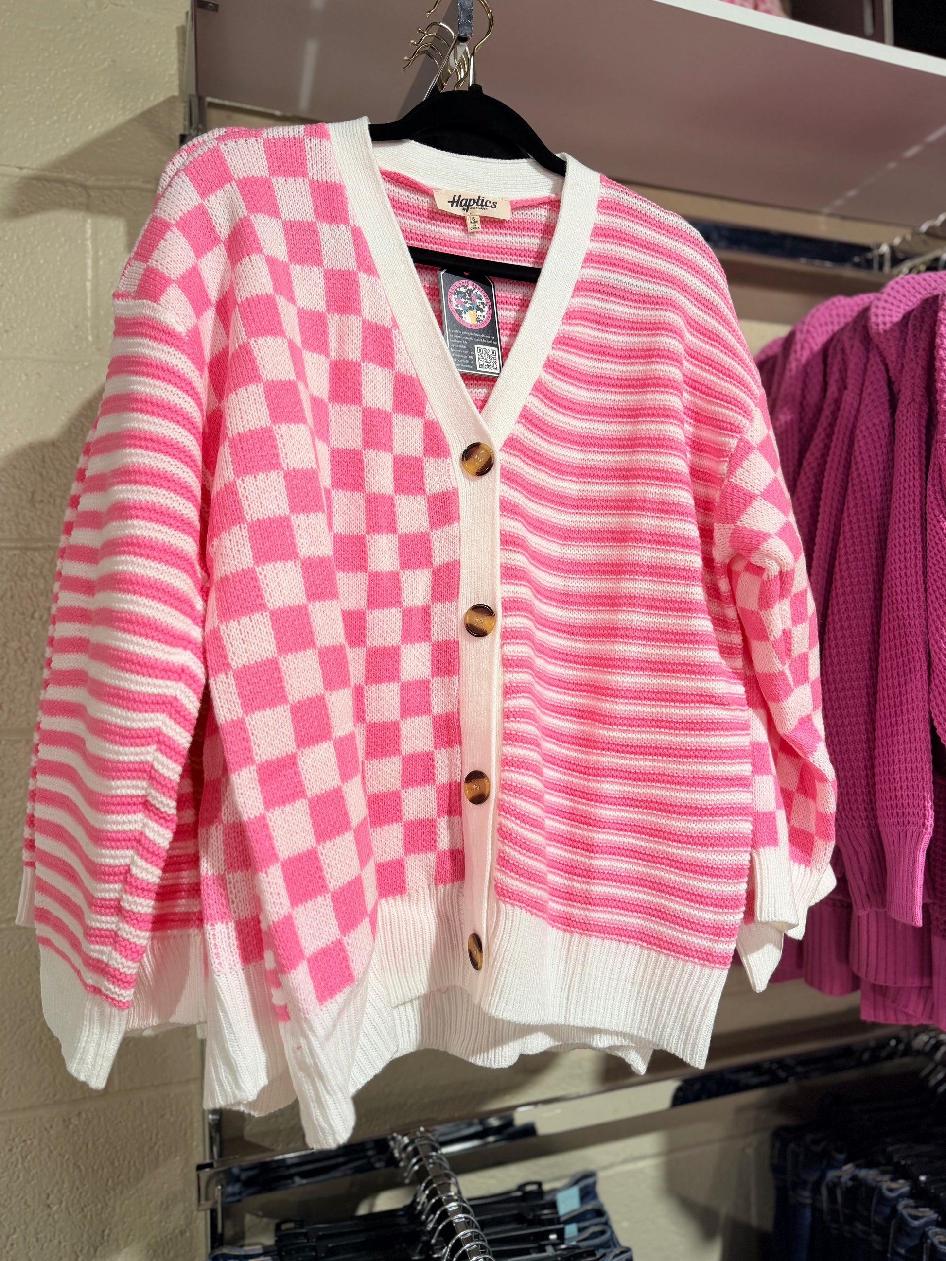 Meet the Pink Checkered + Stripes Button Cardigan—where fashion meets fun in a cozy embrace!