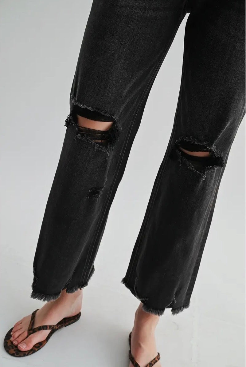 Get ready to elevate your denim game with the Taylor Super High Rise Jeans! These ultra-stretchy jeans from Mica feature a flattering vintage black wash, distressed knees, and a frayed hem for a touch of edgy style. Perfect for curvy figures, these jeans promise comfort and a flattering fit.